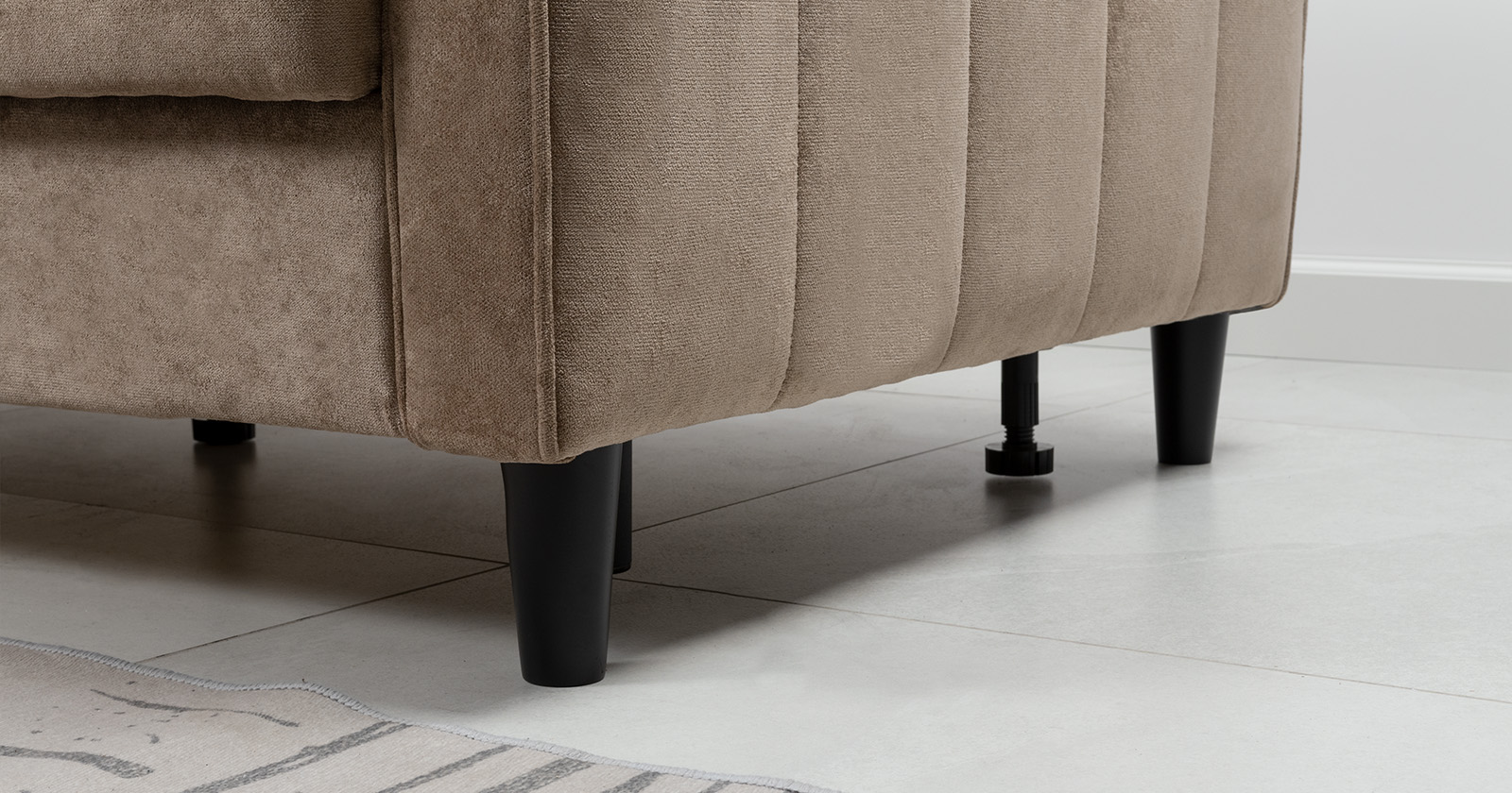 Модель с универсальным углом подойдёт любителям часто менять обстановку. Устойчивые конесообразные деревянные ножки придают дивану легкость и изящество. Для завершения интерьера можно заказать кресло Арно.