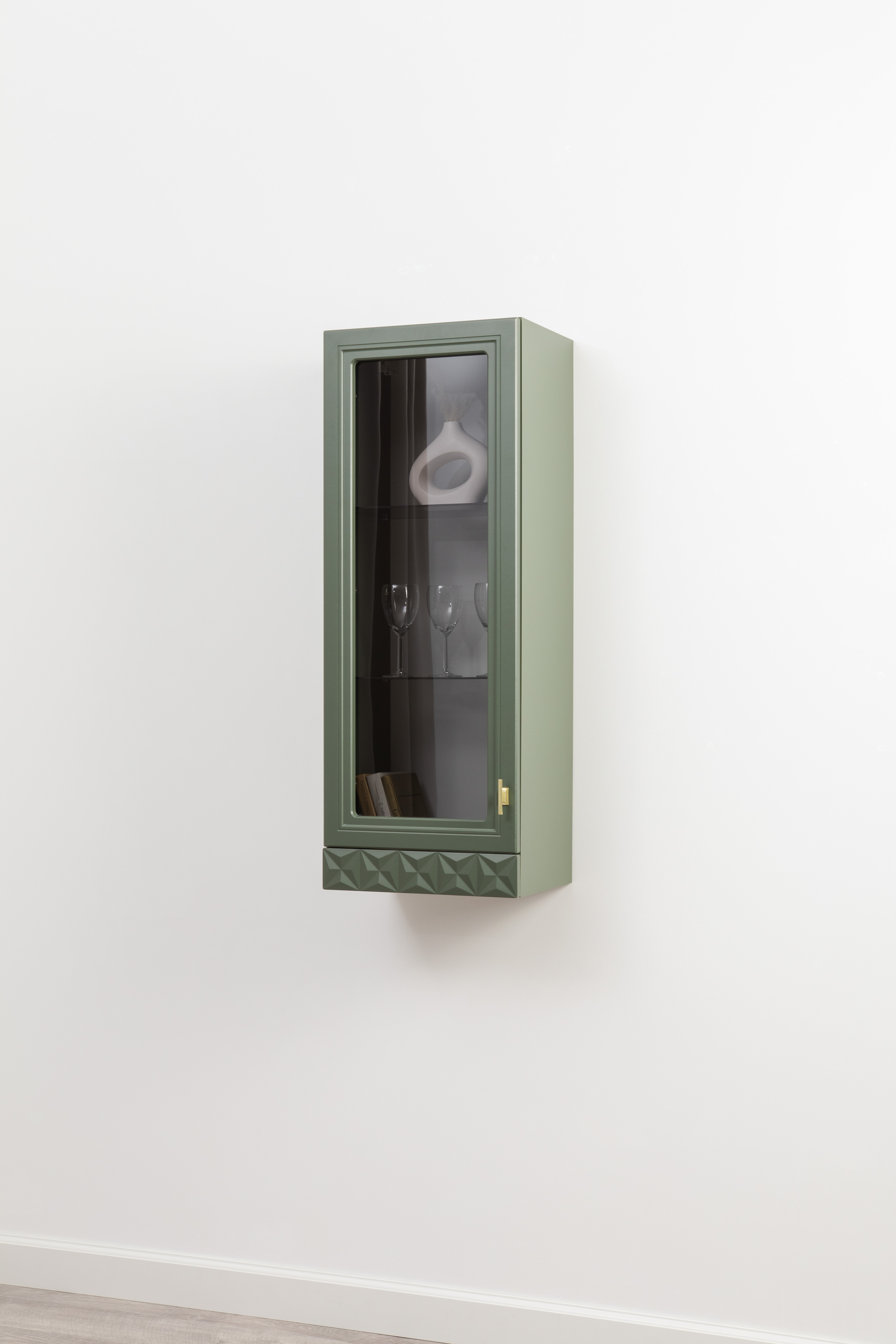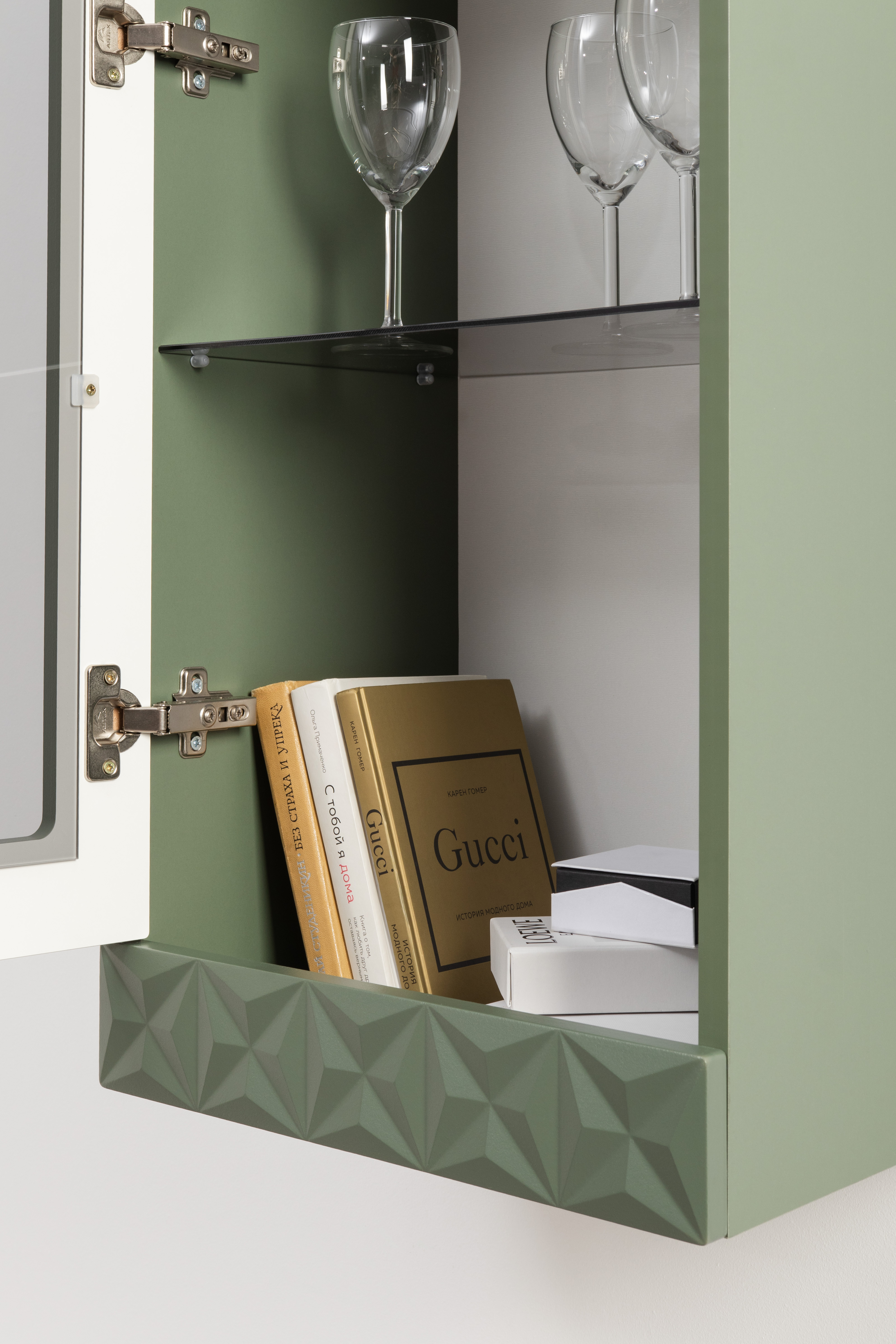 Изящные линии, глубокая фрезеровка фасадов из МДФ и благородные оттенки. Утончённая «Слоновая кость» и изысканная «Олива Шагрень» с глубоким зелёным тоном — создают атмосферу уюта, тепла и благородства. Металлические ручки и опоры золотого цвета придают мебели утончённый блеск, а петли и направляющие с доводчиками обеспечивают плавное и бесшумное закрытие фасадов.