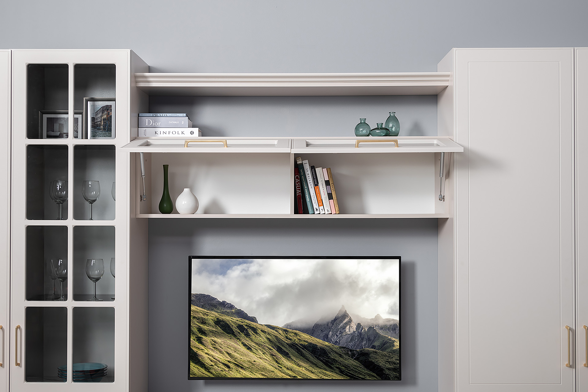 Гостиная Ричфорд композиция 1 с карнизами, кашемир 5981 BS, моно керамика D166-2 ПВХ, белый PE шагрень (собирается на любую сторону)