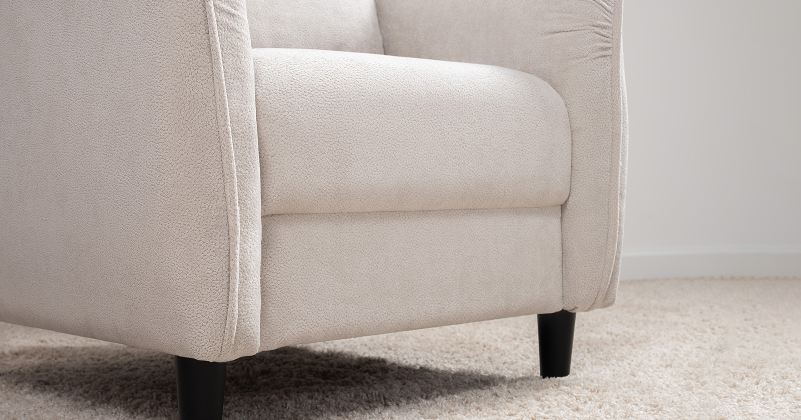 Кресло с приспинной подушкой трапецивидной формы на молнии, по трем сторонам которой проложена отделочная строчка на 1,2 см. По контуру боковин проложен декоративный кант на 1,2 см основной ткани. Кант проходит по центру передней части боковины, а по внутренней верхней части сборка.