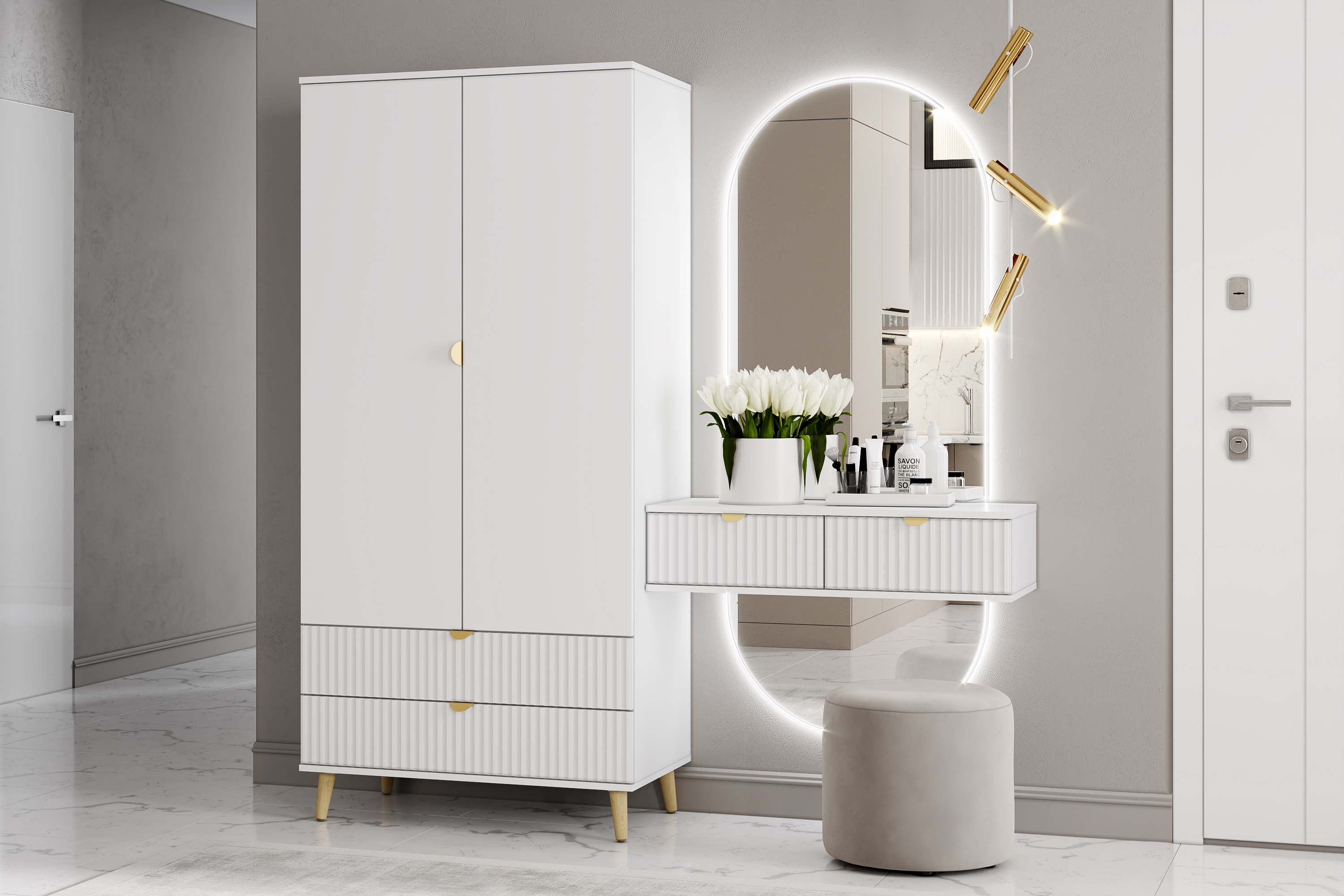 Шкаф оснащен двумя выдвижными ящиками, которые открываются плавно и бесшумно благодаря шариковым направляющим, полками, а также овальной штангой для организации предметов гардероба, а высокие опоры облегчают процесс уборки.