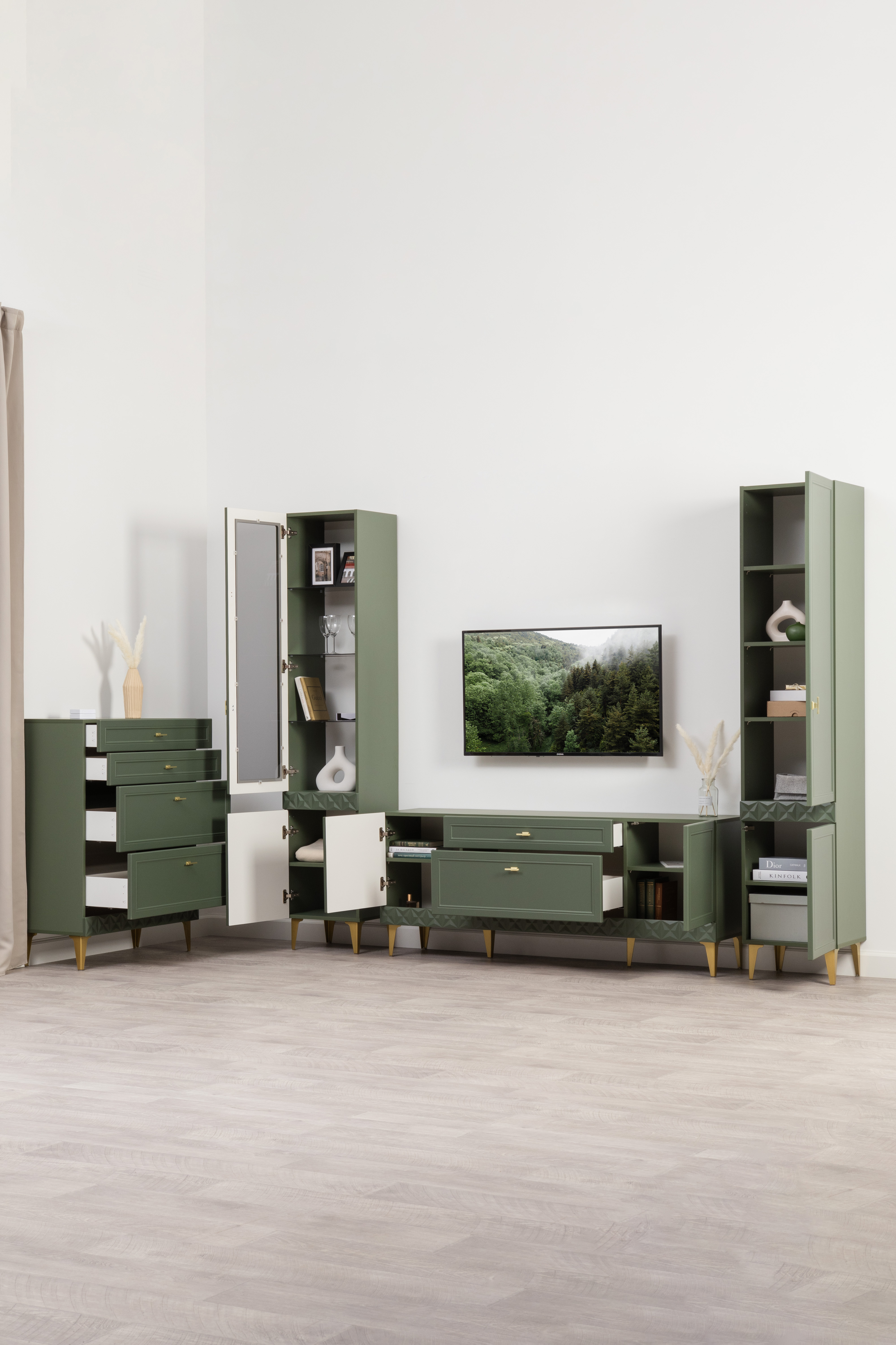 Изящные линии, глубокая фрезеровка фасадов из МДФ и благородные оттенки. Утончённая «Слоновая кость» и изысканная «Олива Шагрень» с глубоким зелёным тоном — создают атмосферу уюта, тепла и благородства. Металлические ручки и опоры золотого цвета придают мебели утончённый блеск, а петли и направляющие с доводчиками обеспечивают плавное и бесшумное закрытие фасадов.