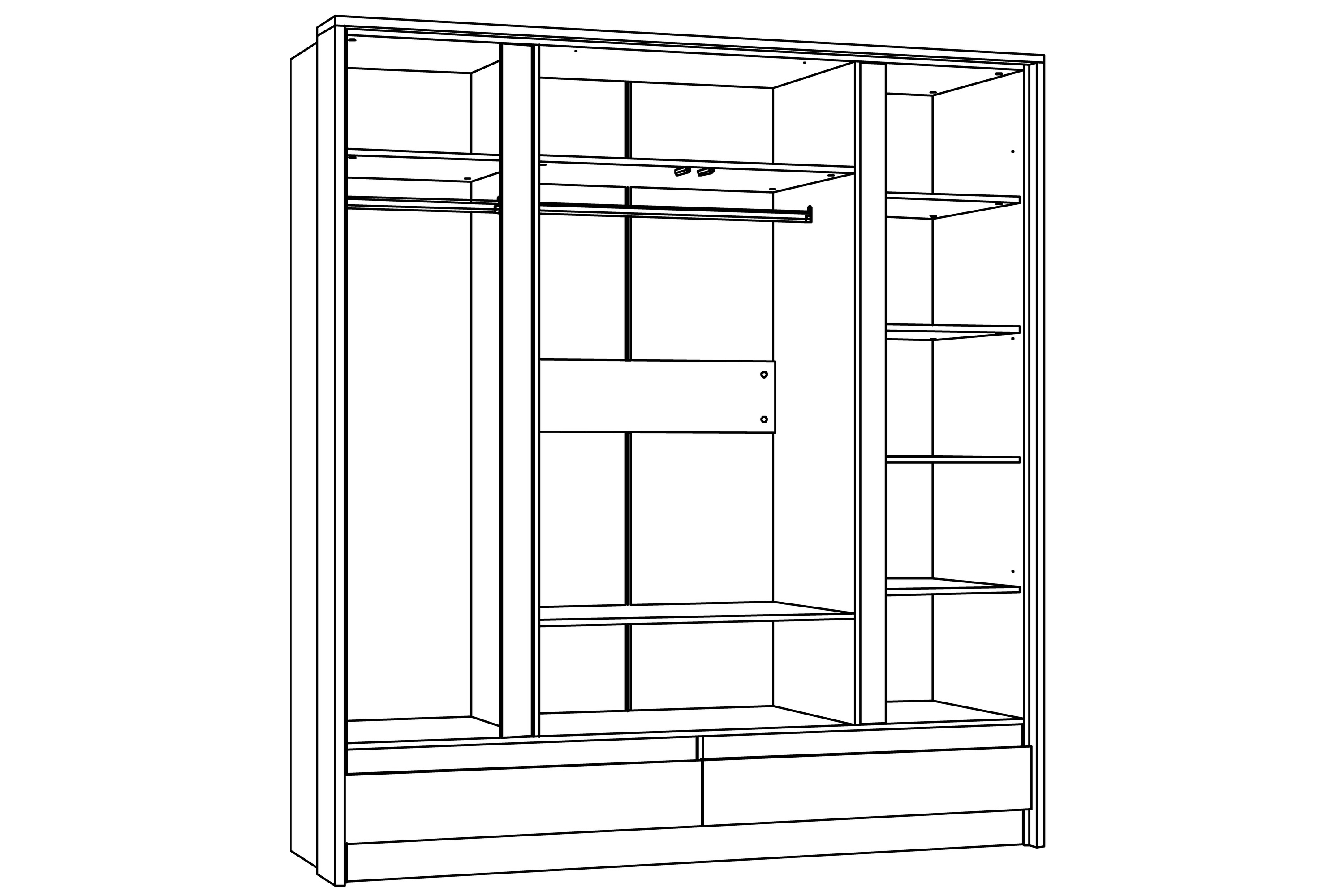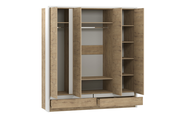 Четырехстворчатый шкаф VIRGINIA НМ 011.51 благодаря своей функциональности и вместительности может заменить сразу несколько предметов мебели, сэкономив Ваши средства и площадь. Шкаф имеет 2 секции с выдвижными штангами, что максимально увеличивает объем хранения одежды и позволяет рассортировать вещи по необходимым характеристикам: взрослая и детская; зимняя и летняя и т.д. Для размещения повседневной одежды лучше всего подойдет отдел с полками, а два выдвижных ящика помогут навести порядок в хранении белья и аксессуаров. Белая рамка по периметру и монохромные планки образуют геометрический рисунок, визуально разделяя фасад модуля на секции, за счет чего шкаф не выглядит громоздким.