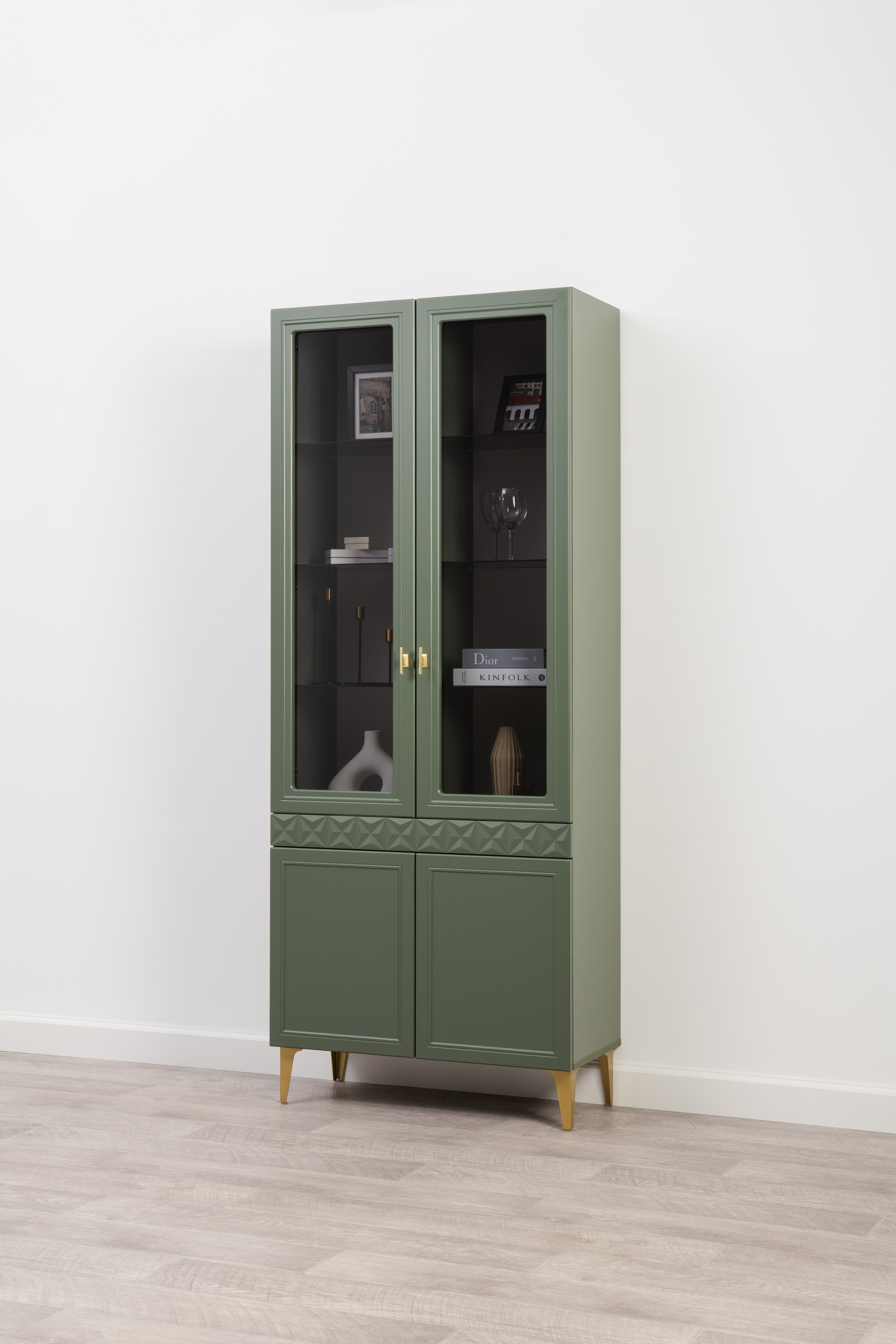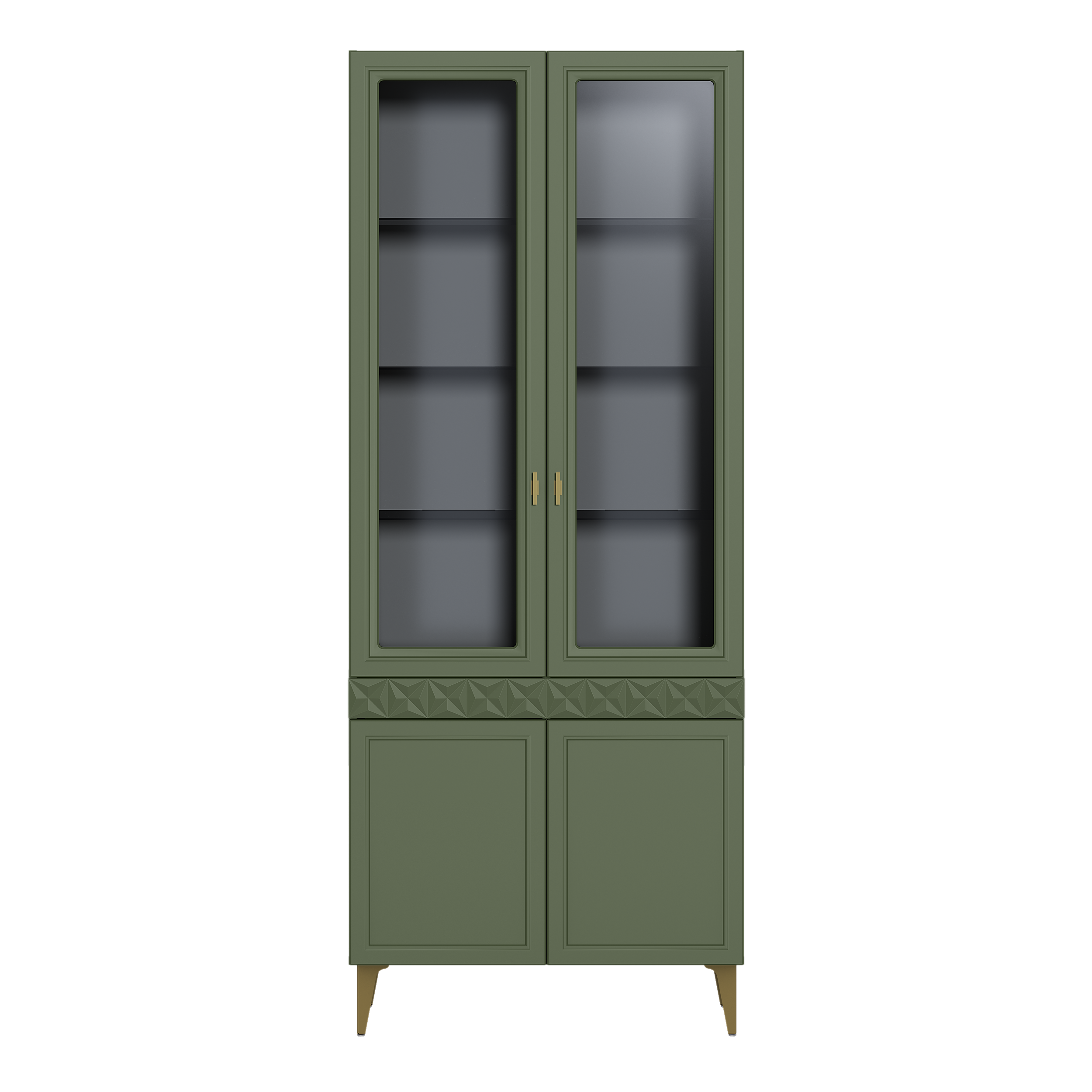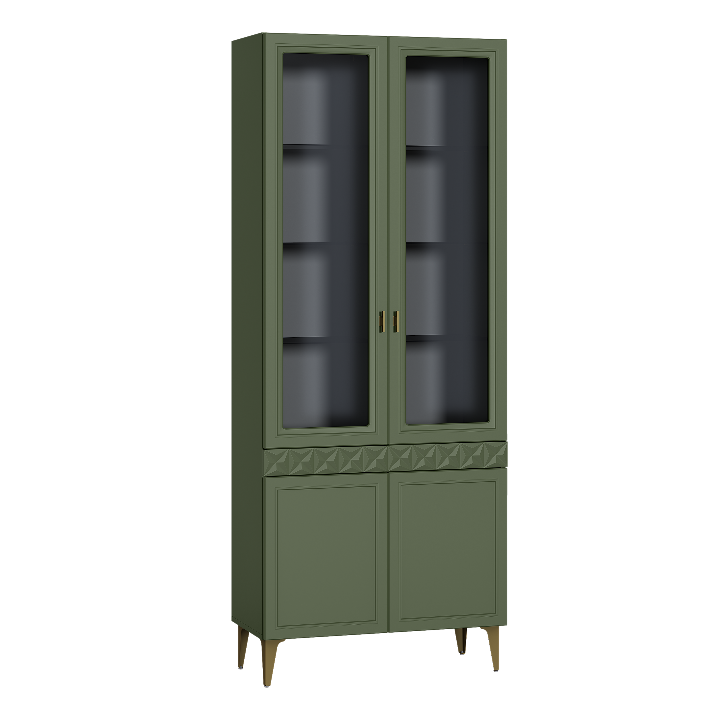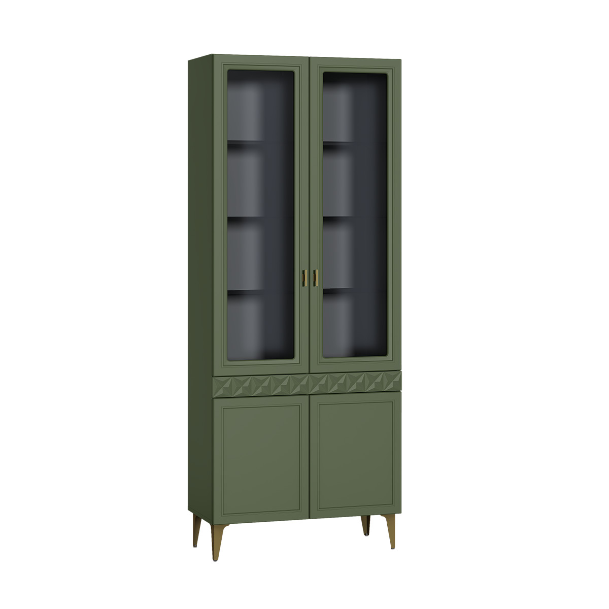 Шкаф-витрина Марион 16.397.02 дымчатый зеленый K521, олива шагрень AG 1050 ПВХ (собирается на любую сторону)