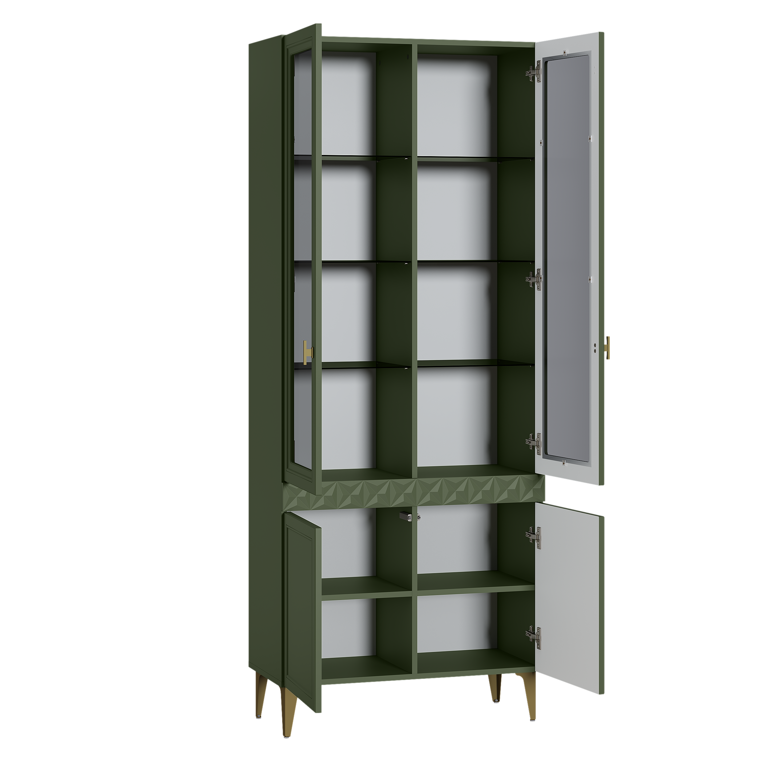 Изящные линии, глубокая фрезеровка фасадов из МДФ и благородные оттенки. Утончённая «Слоновая кость» и изысканная «Олива Шагрень» с глубоким зелёным тоном — создают атмосферу уюта, тепла и благородства. Металлические ручки и опоры золотого цвета придают мебели утончённый блеск, а петли и направляющие с доводчиками обеспечивают плавное и бесшумное закрытие фасадов.