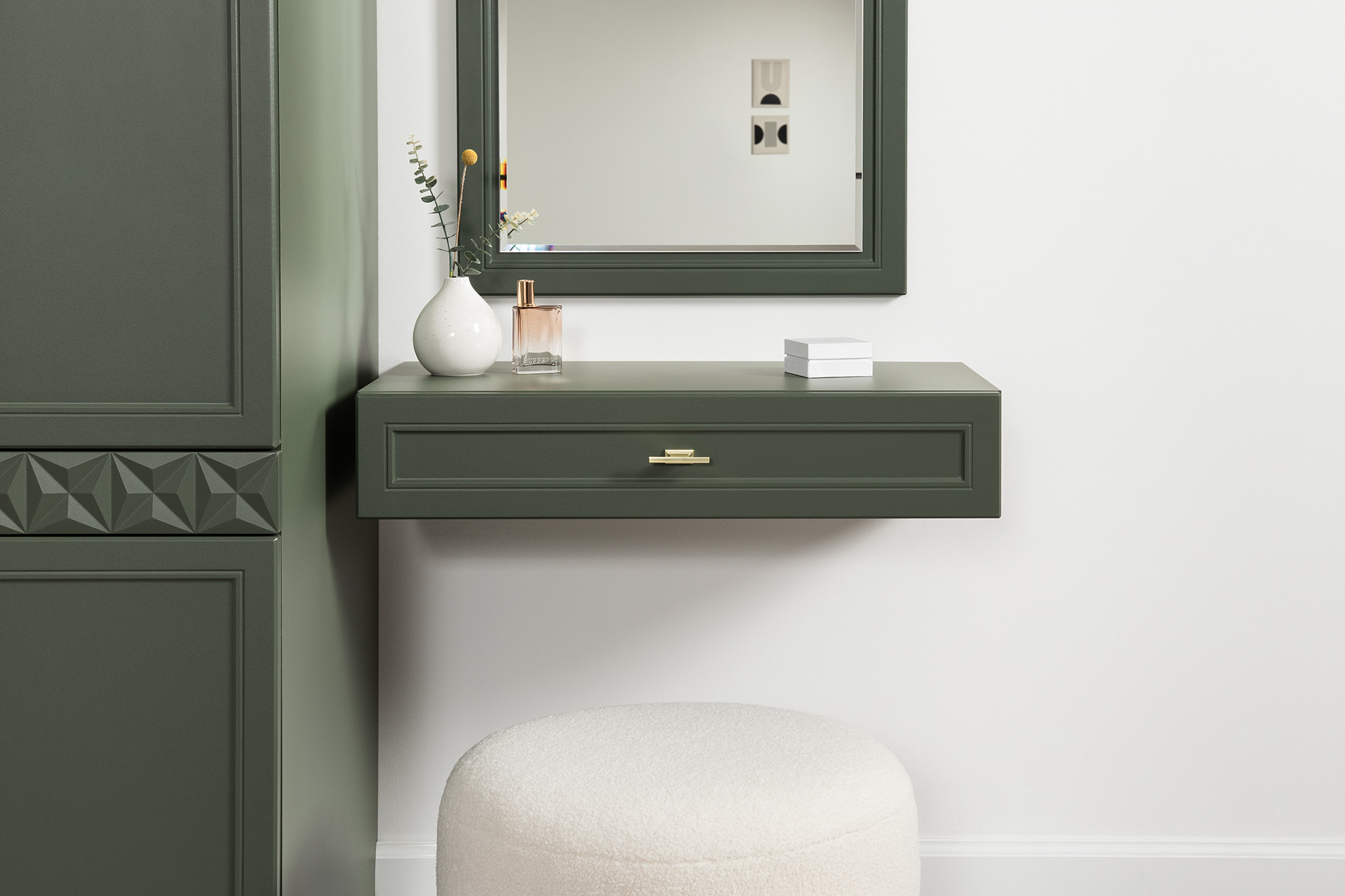 Комод Марион 16.256 дымчатый зеленый K521, олива шагрень AG 1050 ПВХ, белый PE шагрень