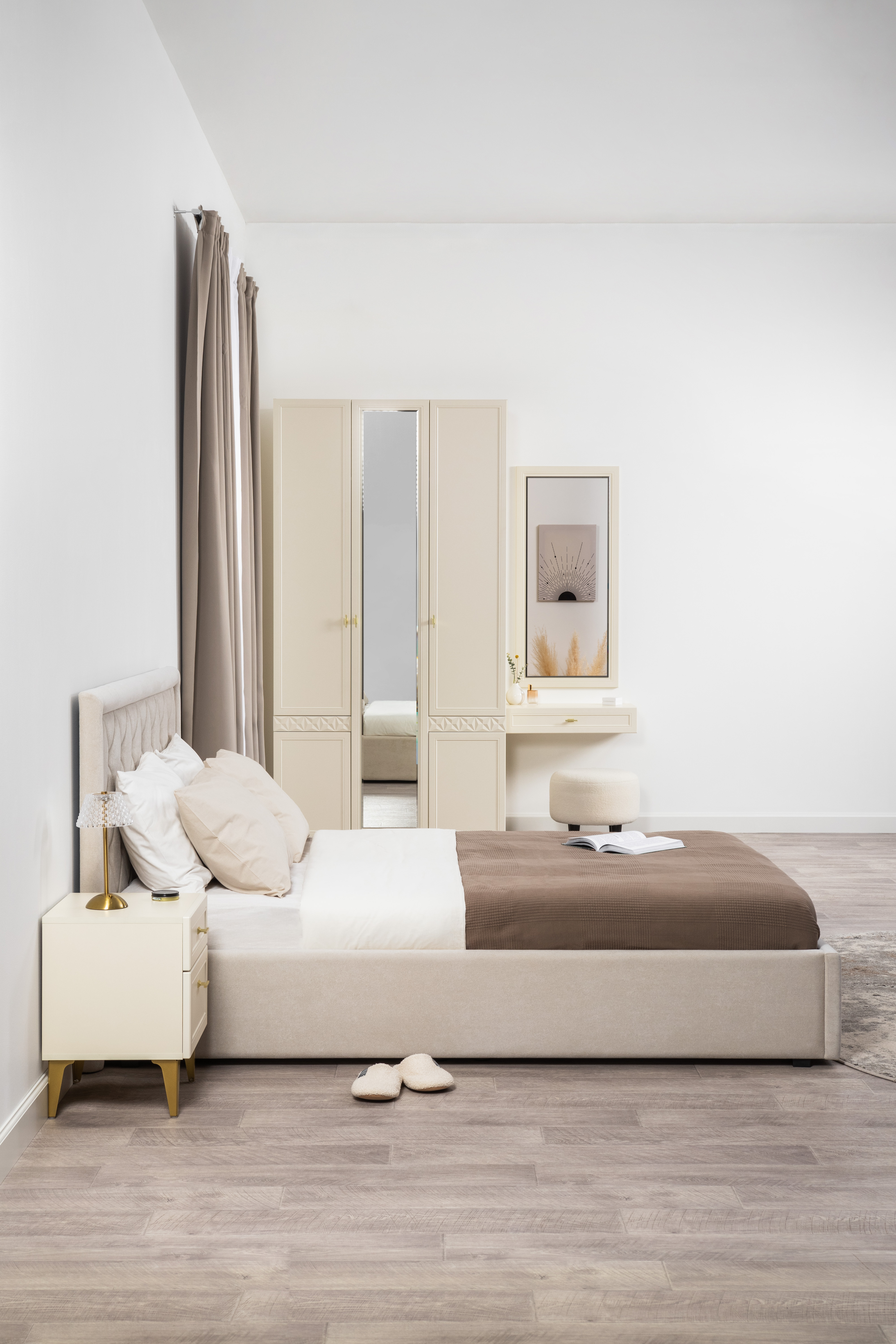 Спальня Дакота композиция 1 меренга, белый, с кроватью Ингрид/Ingrid 1600 велюр ультра смог/ultra smoke, пуф Альба 450 велюр ультра смог/ultra smoke